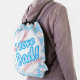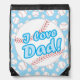 A big white and red stitched baseball with blue outlined text that reads I Love Dad on a drawstring backpack perfect for both boys and girls! The bag itself is light blue with lots of little white baseballs.