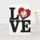 This card features the word “LOVE” stacked vertically in tall, dark letters on a bright white background, with the “O” replaced by a red heart that cradles a white baseball at its center 🥰. The “L,” “V,” and “E” are textured black, and tiny white speckles scatter across the letters and the heart like worn-in print from a favorite old tee. The heart’s rich red draws your eye first, and the baseball inside it feels like a shared secret between two fans, tucked close as if held carefully ❤️. The baseball is smooth and crisp, with curved red stitching that loops neatly around the seams and adds a little motion to the still layout. “LOVE” reads from top to bottom, centered on the card, with the black letters framing the heart-and-baseball “O” as the focal point. The contrast stays simple: black type, red heart, and a clean white field that makes the shapes stand out clearly. Fine speckling continues across the dark letters and the red heart, while the baseball remains bright white with sharp red stitches.