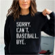 Baseball Mom's and Dad's understand this! " Sorry. Can't. Baseball. Bye. " Old jersey font . Distressed style. A fun and funny design for baseball mom and dad. Available for other sports!