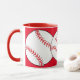This mug features red and white baseballs surrounded by a red background. The text reads: Baseball Mom. Easily customize the text for a special sports fan or remove entirely. Great for Mother's Day or any time of year.