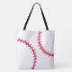 Baseball or Softball Red Personalized Kids Unique Tote Bag. Two sizes and strap lengths available. A custom gift for a baseball fan. Dark red background with a large white baseball with red stitching on front and back. Front has text to personalize name in cursive white font. Back of tote bag is white with red baseball stitching. Sports tote bag makes a great gift for baseball loving girls or boys. Customize to change font style or background color.