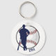 This keychain features a blue baseball player and bat silhouette against a white ball image complete with red stitching. Your monogram is in navy blue at the bottom. The white back has two custom text fields.