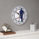 This is an attractive wall clock for that guy who is a true baseball fan. It features a blue baseball player and bat silhouette against a white ball image complete with red stitching. The image is placed on a light gray background. The black numbers make it easy to read.