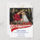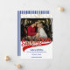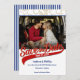 Vintage baseball save the date in red and blue with gold pattern baseballs above photo and blue vintage baseball stripes on back.