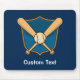 Baseball icon with two bats and a ball over a blue shield. Custom background color. Custom text.