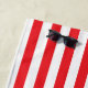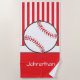 This personalized baseball themed beach towel features red and white stripes behind a big red and white baseball. A template area is provided at the bottom for you to personalize with your name or other text.