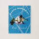Personalized Happy Birthdayjigsaw puzzle has a Baseball theme, with baseball graphics of hitter and catcher at center, as well as a baseball!, You add your personalization at the personalize prompts. To change the background color, edit further