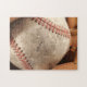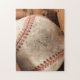 Cool men's retro baseball jigsaw puzzle for guys who are sports fans or baseball fanatics in a challenging puzzle designed with an old baseball glove and worn baseball you can use to pass the time while staying at home or safe at home.