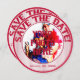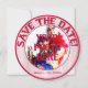 Baseball Wedding Themed Save the Dates, Template 01-Round Save the date cards. The front side of the card is a photo insert/frame. Remove my picture and replace it with your own. Red inner and outer rings with a personalized photo in the center. Decorative red glass text circles around the top and reads: SAVE THE DATE. At the bottom is a text area for you to PERSONALIZE with. Fill in with the appropriate date, bride and grooms names, etc. If you do not want the text just delete/clear it from the template. The outer rim background is red and white baseball stripes. On the back side of the card you have the same text at top and bottom on a striped background. Little heart embellishments sit between the words. The center background is solid white with baseballs scattered throughout. Decorative cursive text reads: HIM and HER (your names) are stepping up to home plate and batting 1000 that their love will last forever. The teams will merge into one on...your date.The baseball wedding themed invites are available in several mix and match patterns. These invites include the envelopes as well.