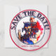 Baseball Wedding Themed-Round Save the date cards TEMPLATE 4. The front side of the card is a photo insert/frame. Red outer and blue inner rings with a personalized photo in the center. Remove my photo insert and replace with a photo of your own. Decorative red and blue glass text circles around the top and reads: SAVE THE DATE. More text sits at the bottom and reads: THE COUPLES WEDDING DATE. Edit the text to say anything, dates, names etc. Delete or clear the text if it's not wanted. The outer rim background is red, white and blue baseball stripes. On the back side of the card you have the same text at top. The center background is solid red with a home plate embellishment on top. Two wooden baseball bats and a popcorn cookie bouquet embellishes the frame. Three thrown baseballs sit across the top and hold text to place the month, day and year of your wedding event. The text on the home plate reads: Grooms Name & Brides Name, are stepping up to home plate and batting 1000 that their love will last forever more. Please join us in celebration as we vow our love and devotion to one another. The party celebration is sure to be a home run!. Be sure to edit all the text areas to suit your special occasion. The Baseball themed wedding cards are available in assorted mix and match designs.