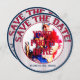 Baseball Wedding Themed-Round Save the date cards-Template 3. The front side of the card is a photo insert/frame. Blue outer and and red inner rings with a personalized photo in the center. Remove my photo insert and replace with a photo of your own. Decorative red and blue glass text circles around the top and reads: SAVE THE DATE. More text sits at the bottom and reads: THE COUPLES WEDDING DATE. Edit the text for dates, the couples names, etc. Delete/clear the text if it's not wanted. The outer rim background is red, white and blue baseball stripes. On the back side of the card you have the same text at top. The bottom text reads: A HOME PLATE WEDDING. Two wooden bats, red and blue sit off to the left. The center background is a white baseball with red stitching. Decorative text curves around the ball and reads: HIM and HER (your names) are stepping up to home plate and batting 1000 that their love will last forever. The teams will merge into one on...your date. Please join us in celebration as we vow our love for one another. The baseball wedding themed invites are available in several mix and match patterns. These invites include the envelopes as well.