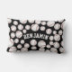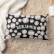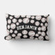 A custom name lumbar pillow featuring a smattering of baseballs of various sizes against a black backdrop.
