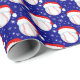 This Christmas wrapping paper features baseballs wearing Santa's hat with snowflakes twirling around on a Christmas navy background.