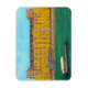 Colourful, stylized painting of Basel's majestic Kaserne (ex Swiss military) building along the Rhine with colourful autumn tress and the little Vogel Gryff Rhine fairy that cross the Rhine from Grossbasel to Kleinbasel on a magnet by popular artist Lisa Lorenz