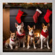 An enchanting scene captures the essence of coziness and holiday spirit as furry companions adorned in Santa Claus hats gather around a crackling fireplace. The warmth emanating from the hearth creates a snug atmosphere for these adorable canines, while festive stockings hang in the background, enhancing the merry ambiance. The charming illustration portrays a timeless image of companionship and festive joy, perfect for celebrating the holiday season with a touch of canine charm.