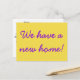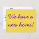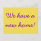 This minimalist yellow new-home postcard design features the message "We have a new home!" on the front, and a customizable message on the back. Postcards like this could be used to inform friends and relatives that the sender has moved to a new house or apartment.