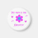 This image features a cheerful and colorful design with the phrase My mom is the Greatest" written in bright pink stylized font. At the center, there's a cute flower with pink petals and a blue circular face, smiling warmly with blushing cheeks. Surrounding the flower are two pink butterflies and two pink outlined hearts, adding a playful and loving touch.