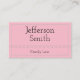 This basic business card design features a pale pink background, a single-line border, and a row of heart shapes. It could be used by a professional such as a family law lawyer, attorney, or counsellor at law. The name, profession and contact details can be personalized.