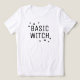 "Basic Witch" funny women's white Halloween t-shirt features a modern and simple black typography design with star shaped accents.