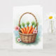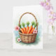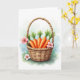 Designed with a soft watercolor look, the scene centers on a rustic woven basket holding a small harvest of orange root vegetables topped with spiky green leaves. The basket’s earthy browns and textured weave sit close to the smooth, glowing oranges, like two friends leaning in side by side for a photo. A few pink blossoms add a gentle, affectionate touch, as if tucked in by someone who wanted the arrangement to feel a little more romantic 🌷. The background fades into airy washes of green and blue, suggesting a sunny outdoor spot without sharp edges or hard lines. Near the upper area, a short greeting appears in small, simple lettering, set in a muted gray that doesn’t compete with the artwork 🐰. The words are spaced with plenty of breathing room, leaving the basket and flowers as the main focus. One blossom rests at the base of the basket, its soft pink petals and golden center clearly defined against the pale ground.