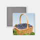 This magnet features a straw basket overflowing with fresh, ripe blueberries. It is set on the grass with pink wildflowers against a pure blue sky.