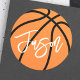 Round stickers featuring a basketball in black and orange and your name in white. All colors are customizable in the design tool.