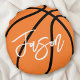 Round pillow featuring a basketball in black and orange and your name in white. All colors are customizable in the design tool.