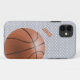 Custom basketball fan iPhone 5 case, with graphics of a light gray sports jersey pattern background. Graphics of a basket ball decorates the bottom right corner of the case and custom rust colored text, on the left side, is ready to personalize. Great phone case for the sports fan or basketball player.