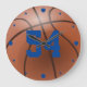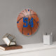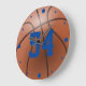 Sports themed round wall clock, with a graphics of a brown basketball and blue dots for numbers. Personalize the large number with your favorite player's number.