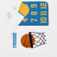Personalized basketball baby blanket with a color theme of blue, yellow black and white. This baby milestone blanket has baby's name, a basketball and hoop on one side, as well as the photo prop numbers for the first 12 weeks and/or months. The other side of the blanket has baby's name and your choice of jersey number. Please browse our store for more personalized basketball gifts.