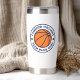 Insulated tumbler featuring a basketball and custom text, for example a name and basketball team, surrounded by a blue border on a white background. Change fonts and colors, move and resize elements with the design tool.
