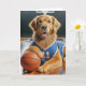 A golden retriever wearing a blue basketball jersey with the number 11 poses confidently on a basketball court, its paw resting on a basketball.