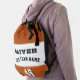 Basketball Player Team Name Number Drawstring bag. The design has a black silhouette of a basketball player with a basketball on orange background. The text is in modern fonts - personalize it with your team name, number and your name. Perfect for basketball players or a keepsake to remember your favorite sport.