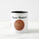 Distinctive coffee mug with a basketball. The design features a large basketball in the center with silhouettes of players in action on either side. Female on one side, male on the other. Personalize with a name. The text is easily changed by using the template. For other desired changes (different type font, color, size, or placement) select "Personalize this template" then select "Edit using Design Tool." Other mug styles, etc. are available -- see Options.