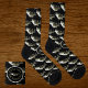 Black socks with a bass fish pattern have, around the ankle area, a solid black circle outlined in off white with a smaller bass fish centered in the wording I'D RATHER BE FISHING. Designed with anyone who loves to fish in mind - these socks might be a great gift idea - and quite a twist on plain old socks for those hard to buy for people.