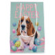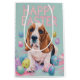 A lively Easter scene featuring an adorable dog amidst a collection of vibrant Easter eggs. The playful canine adds charm to the festive atmosphere, surrounded by an array of colorful eggs adorned with whimsical designs.