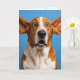 A basset hound with impressively large ears appears against a bright blue background, giving a comical and surprised expression.