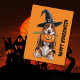 Basset hound wearing witches hat & pumpkin postcard