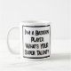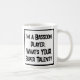 Funny slogan on a Coffee mug that says "I'm a Bassoon Player. What's YOUR super talent?". Coffee Mug for a Bassoon or someone who plays Bassoon. Black and white bold text.