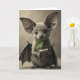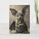 Designed with a sweet St. Patrick’s Day twist, the card shows a bat-and-fox-like puppy creature centered and looking straight at you with glossy, obsidian eyes that feel tender and inviting. Its oversized ears frame its face like soft wings, and its fur shifts through warm taupe and sepia tones with fine whiskers catching the light. The background stays muted and minimal, so the creature’s gentle presence feels close, like it’s sharing a quiet moment with a friend. A bright emerald four-leaf clover rests in its mouth like a shy offering ☘️, adding a small spark of green against the calm palette. In its tiny clawed paws, it holds an old, worn book with faint, hard-to-read lettering, hinting at late-night reading and soft companionship. The St. Patrick’s Day greeting sits near the top in green text, with a smaller line beneath it in a lighter green that doesn’t compete with the portrait 💚. Under its feet, the ground shows a rough, sandy texture with subtle shadows pooling around its toes.