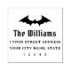 Halloween return address rubber stamp featuring a flying bat silhouette. Below is the name or family name in a gothic style font and the return address.