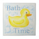 Cute yellow rubber ducky surrounded by bath bubbles, on a decorative bathroom tile!