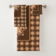 This is a bohemian bath towel set. Its rich colors give it a bold look. The background is rich brown. The medallions are brown, gold and orange. The Medallions come from actual handmade tile. Check out the matching Shower curtain and Bathmat. The design was inspired by the tile maker's rug. From Oregon tile maker Fay Jones Day