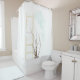 Bathroom curtain evoking spa, body care, zen relaxation. Soap balls, pebbles, plant pattern, bamboo scale. Soft and delicate colors.