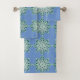 This set of towels features a green medallion/mandala design on a lavender-blue background. Look for the matching items in this collection. Designed by Oregon Tile maker Fay Jones Day