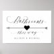 Simple Elegant Calligraphy Script Wedding Reception Bathrooms This way Arrow pointing Left directional Sign, in beautiful flowing fancy letters and your personalized names. A stylish yet simple formal design in black and white or any background color you choose. Just click the customize further link, shown under the text personalization area on the right, and choose your custom color background. This sign poster template makes it fast and easy to create stunning additions to your wedding decor. Signs can be enlarged, there are many sizes to choose from, as well as options for custom framing and matting. Wedding this way custom signage.