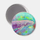This colorful batik design magnet features a humpback whale drawing of a head, eye and fins underwater. Purple, teal, maroon, navy and yellow swirl together to create the watery undersea art.