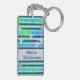 Pretty key chain for quick sorting of keys to your vacation home with your name and optional phone number on the reverse. Your choice of shapes and styles. Created in batik style striped shades of seafoam green and marine blues with navy and white contrasts. See other matching items at Camp_and_Cottage on Zazzle.