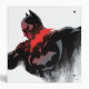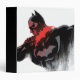 This striking artwork captures Batman as he emerges from the shadows, reflecting his dual nature as both a symbol of hope and an avenger cloaked in darkness. The graphic utilizes a stark contrast between the deep blacks and vivid reds to emphasize Batman’s intense and complex persona. The left side shows Batman partially obscured by a smoky, textured effect, symbolizing the mystery and the enigmatic qualities of his character. The right side reveals his determined profile in clear, bold colors, highlighting his unwavering resolve to fight crime. This artistic depiction combines modern design elements with classic superhero imagery, creating a powerful visual representation of Batman’s ceaseless vigil over Gotham City.