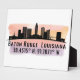 Tabletop art plaque features skyline silhouette of Baton Rouge Louisiana with map coordinates and a watercolor splash background.